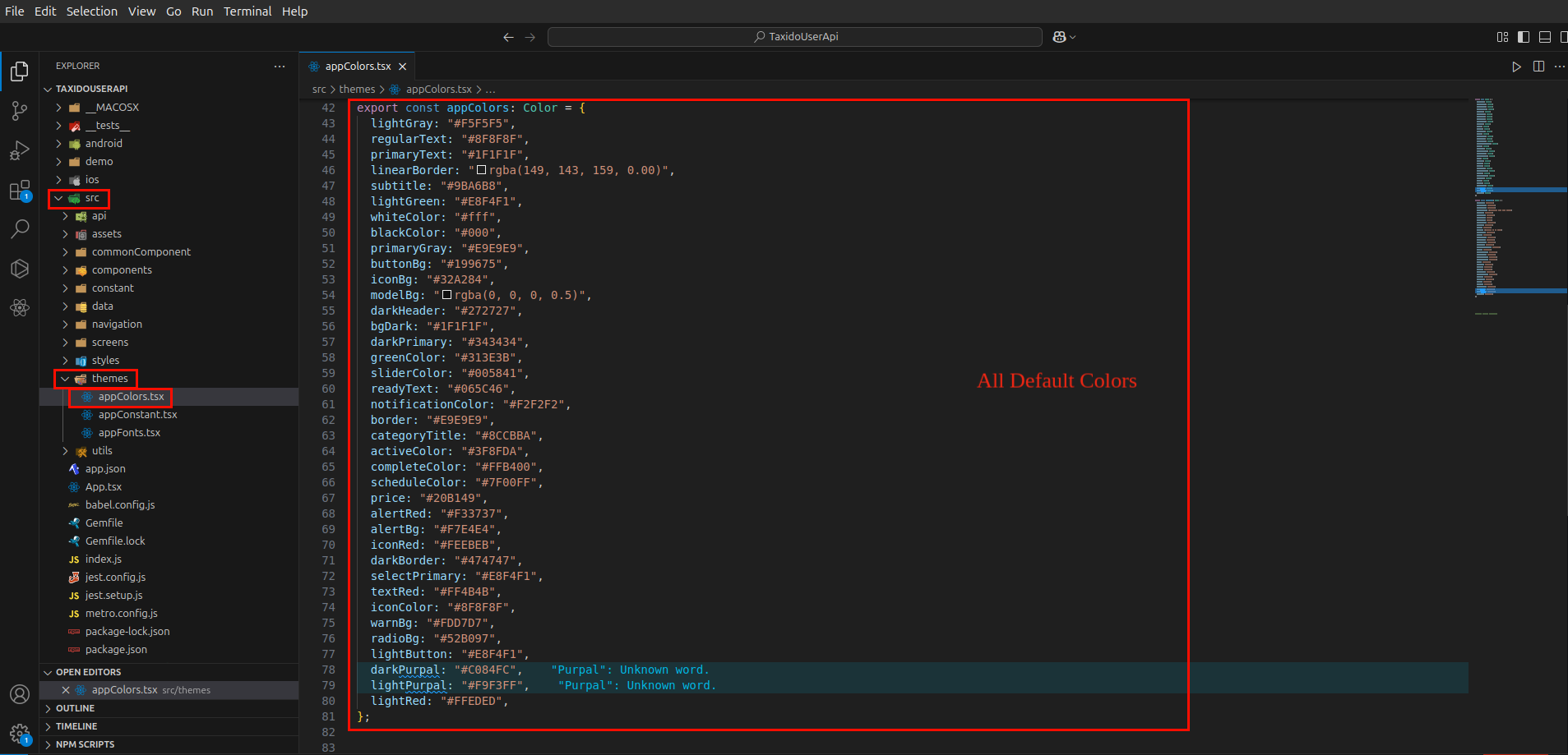 1. Open your project Navigate to src/theme/appColors.tsx in you should already have a theme configuration file inside the src/theme/appColors.tsx that defines the color palette and styles for both dark and light modes. It may look something like appColors.tsx<br>
