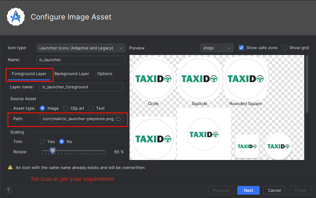 5. Choose your app icon image path in the Foreground Layer from the pop-up that appears.<br>