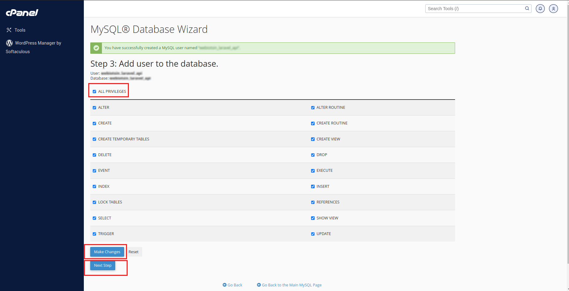 Add a user to the database, give them all the necessary permissions, and then click 'Make Changes.' After that, click 'Next Step.