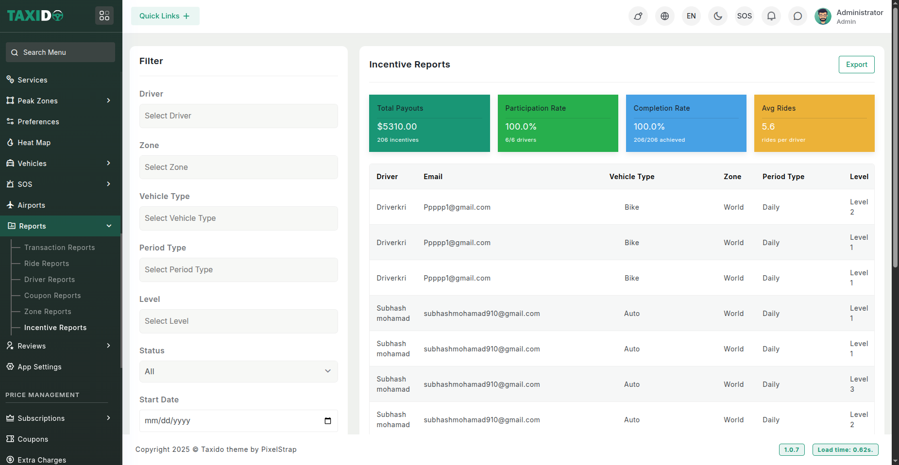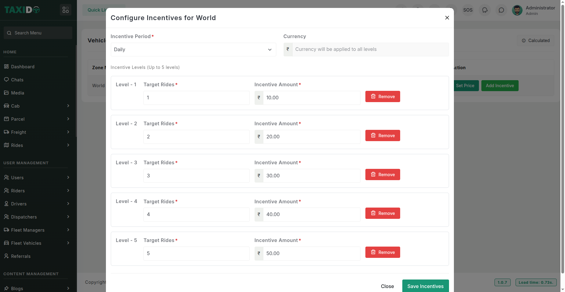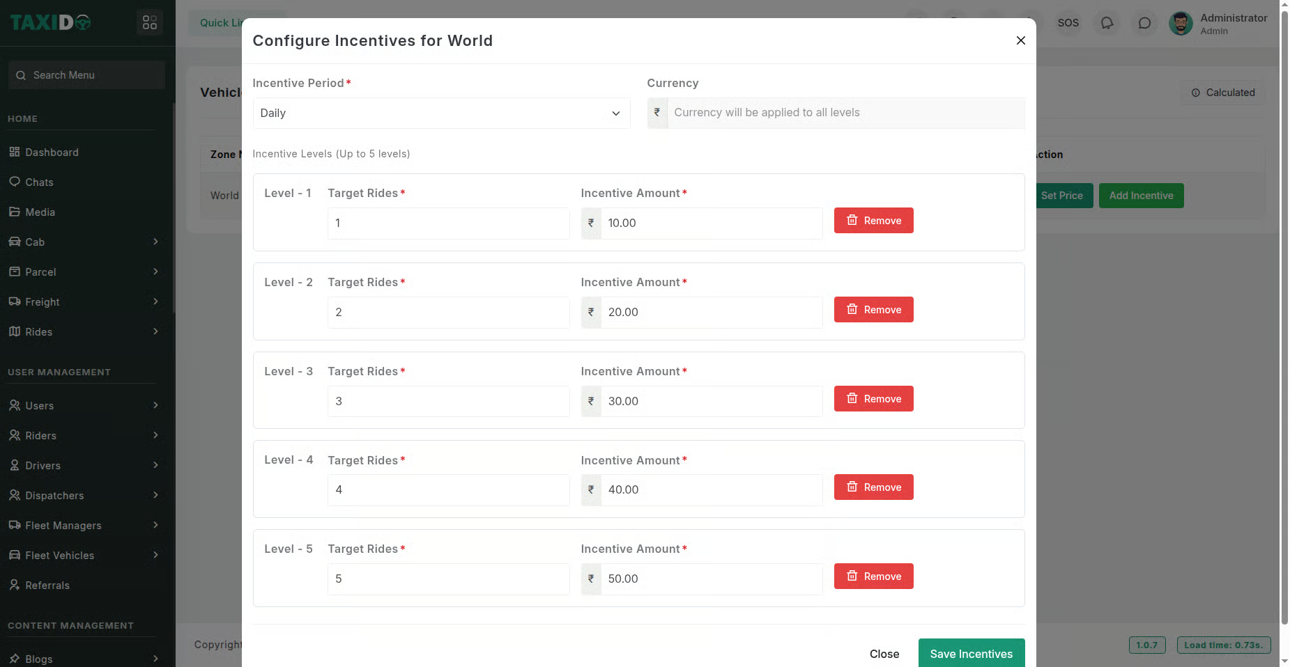Drivers progress through 5 levels based on their experience. Each level has a fixed incentive amount per ride.