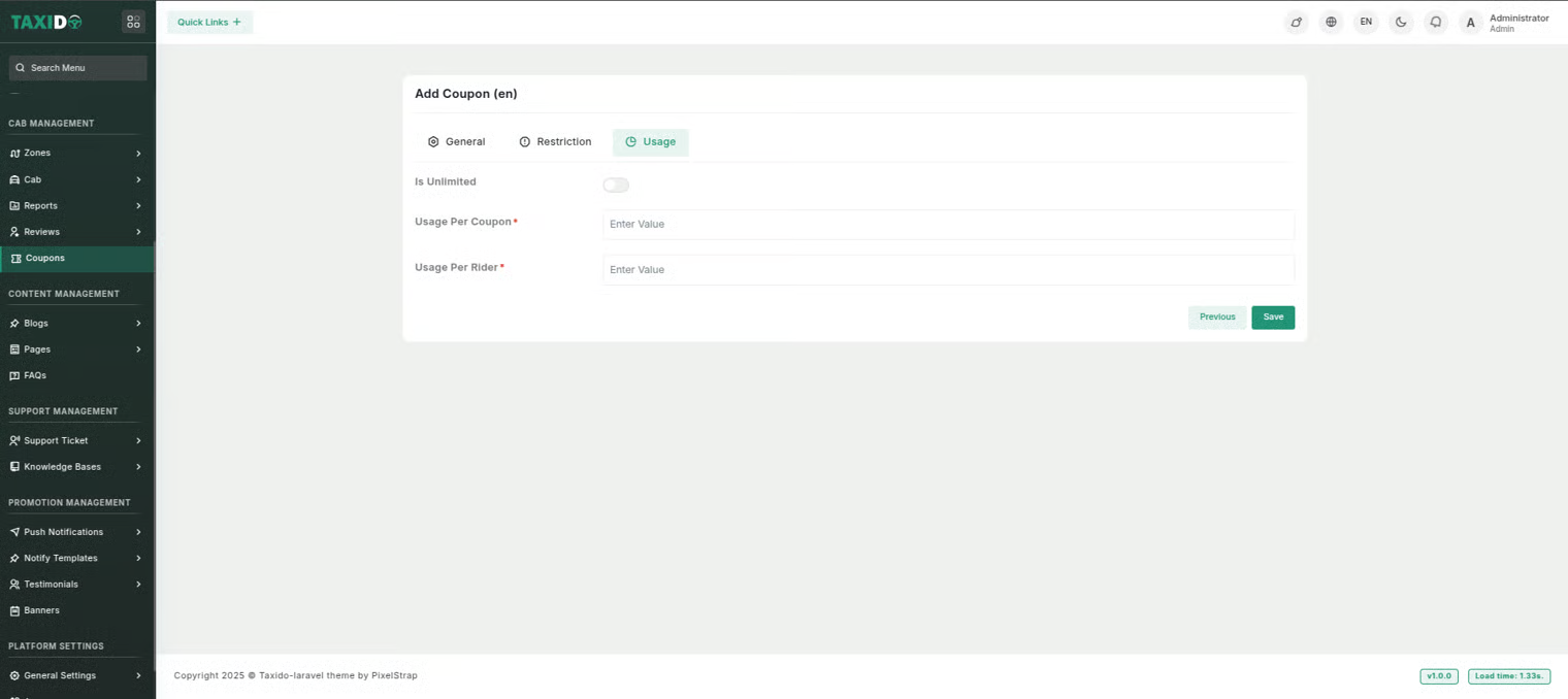 &#x20;Is Unlimited: Use this option to activate or deactivate unlimited usage of the coupon. If enabled, the             coupon can be used an unlimited number of times; If disabled, you must specify the Usage Per Coupon and Usage Per Rider value.