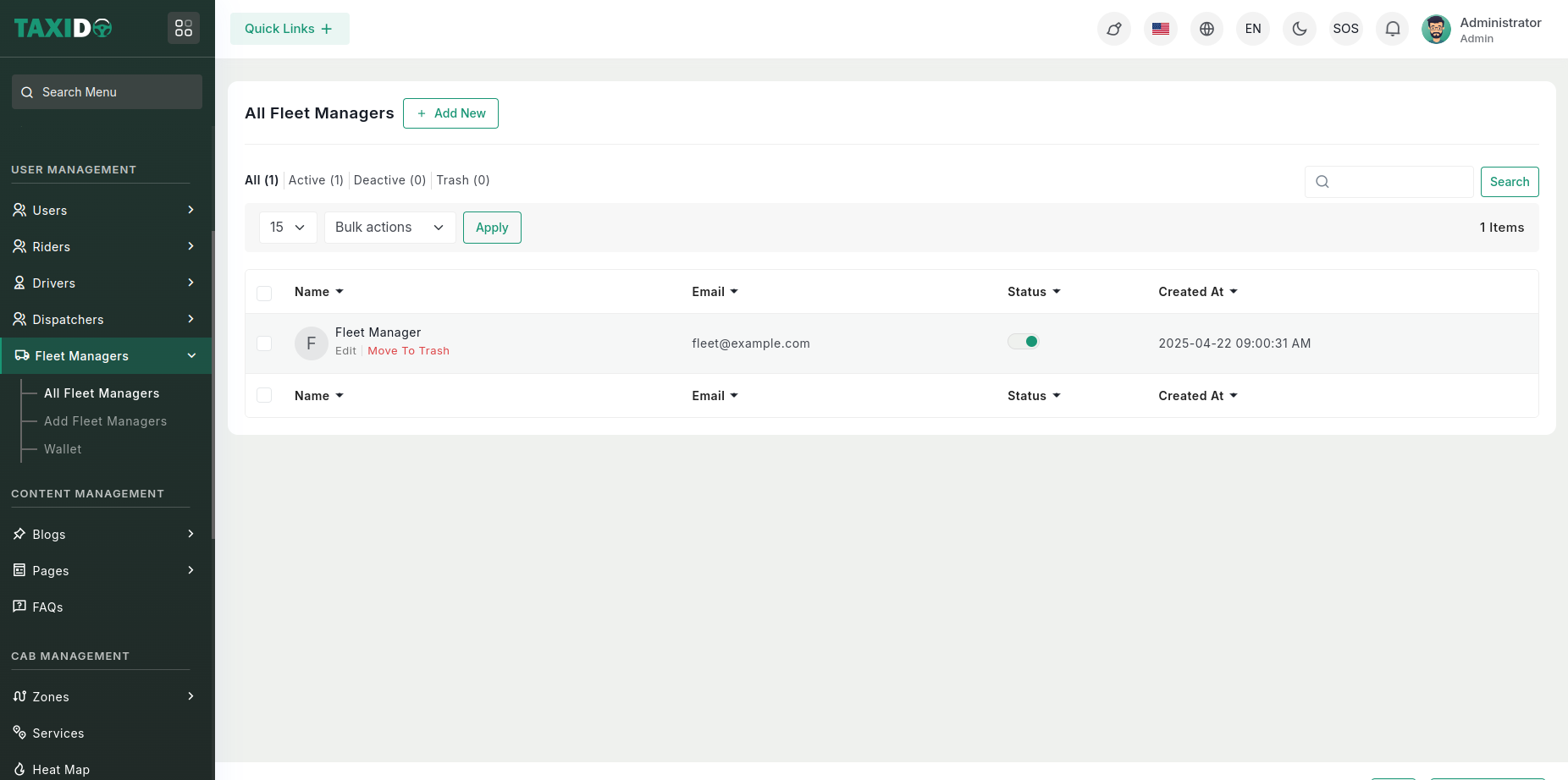 **Fleet Managers** This module manages the details and earnings of fleet managers within the admin panel.